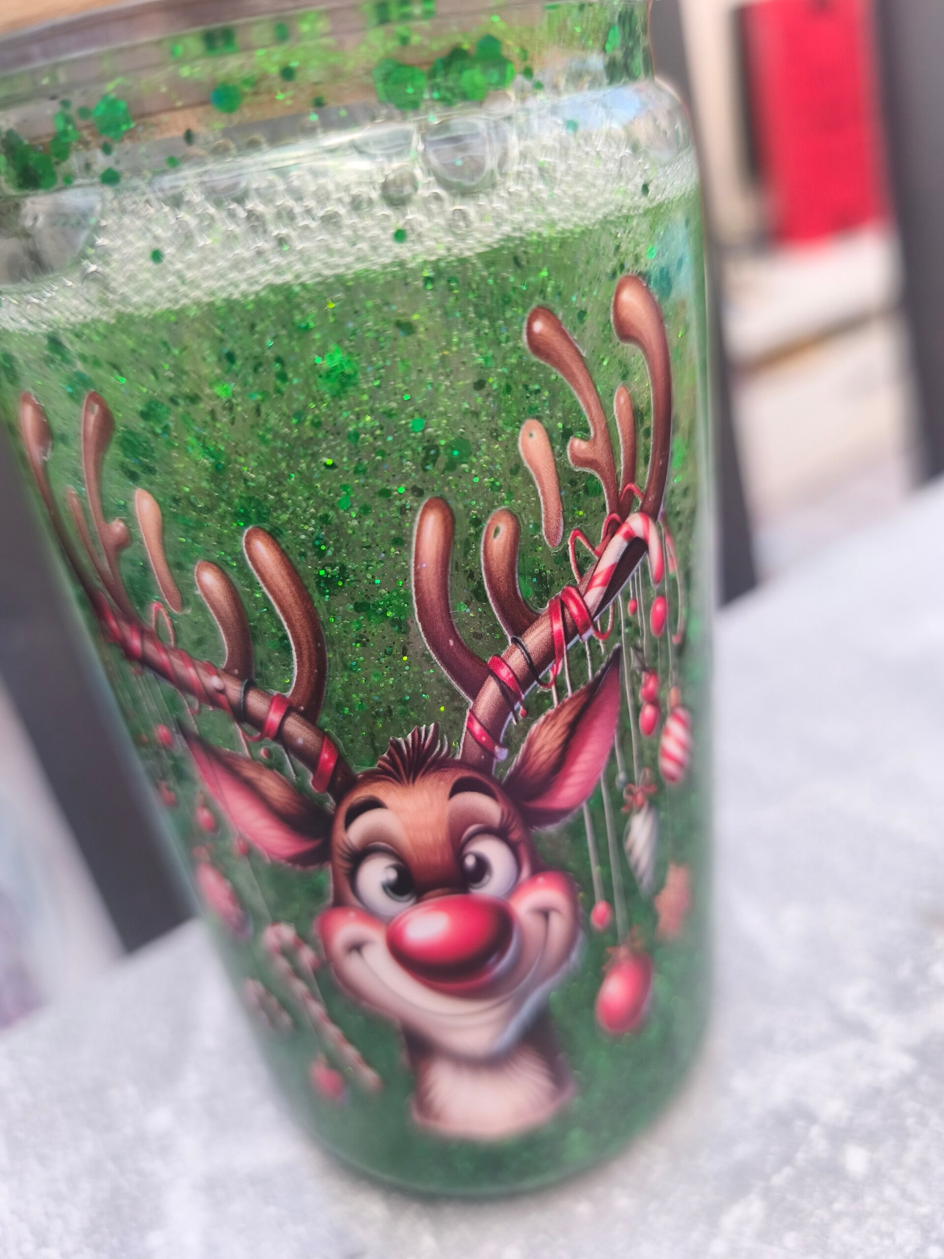 Ein schöner Trinkbecher mit Bambusdeckel und Strohhalm,im schönen grünen Glitzer versetzt und einer tollen Rentier Motivfolie runterum versetzt. Er erhält den Glanz der Weihnachtsstimmung.