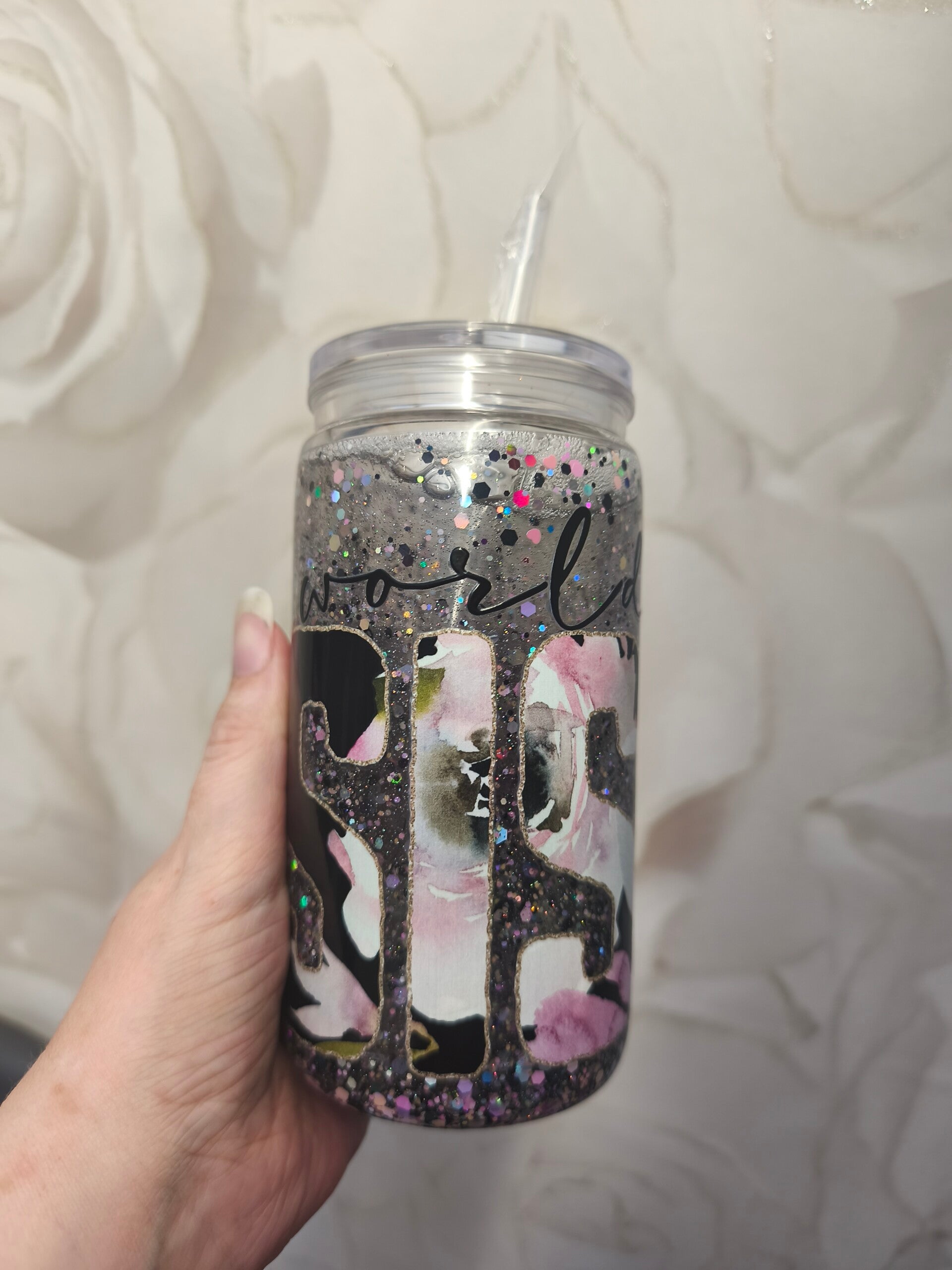 Sprich Best sister in the world,abgesetzt mit silber,schwarz und lilanen Glitzer.